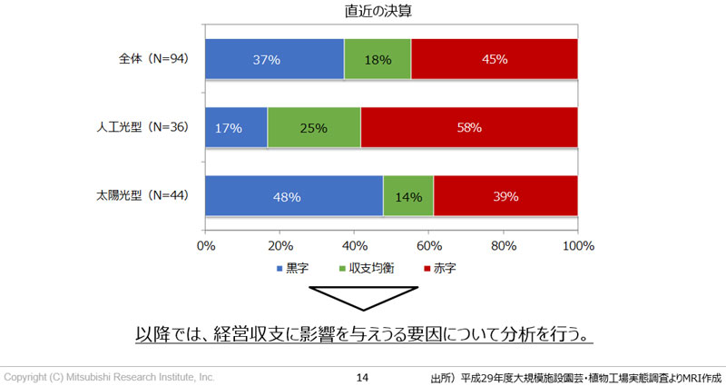 また全体の収支状況では、黒字・収支均衡の合計が55%で、赤字の45%を若干上回っている。ただし、人工光型は赤字が58%で、黒字・収支均衡の42%よりも多い。太陽光型は黒字・収支均衡が62%となっている。