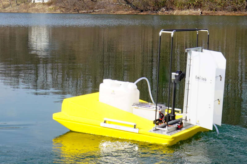 株式会社イーエムアイ・ラボは、除草剤を散布する小型無人ボートの販売を開始した。操縦の複雑さは無く、小回りがきいて軽量であるため、水田における除草剤の散布を、手軽に行うことができる。