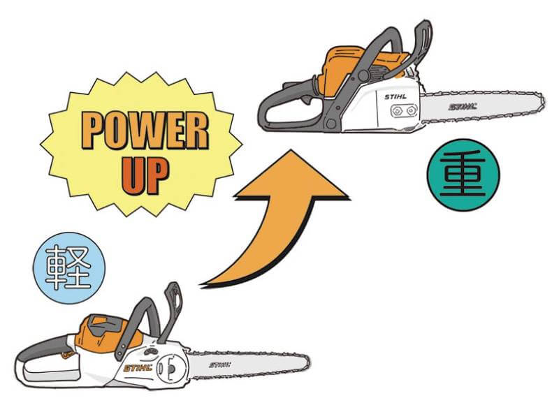 ハイパワーなモデルを選べば、太い木や堅い木でもバンバン切ることができ、高効率に作業できる。しかしハイパワーモデルは排気量の大きいエンジンを搭載しているから、チェンソー全体の重量は重くなる。軽量モデルを選べば、取り回しは圧倒的に良くなるが、太い木や堅い木を切る頻度が高い人にとっては効率的ではない。