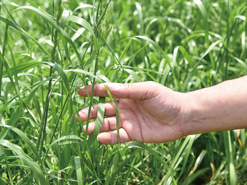 「無農薬だからといって、農薬を撒かないだけでは、牧草は雑草に負けてしまいます。また当社は無化学肥料で栽培していますが、有機肥料は使用しています。詳しくは言えませんが、肥料の種類、与えるタイミング、それから牧草を育てる工程に門外不出のノウハウがあるんですよ。牧草は、イネ科・マメ科に大別され、そのなかにも色々な種類があるのですが、これを回しながら栽培するのが大切です。それにより食味向上・雑草抑制・地力維持を同時に行っているんですよ。雪印種苗さんと協力しながら、より良い品種の開発も行っています」。