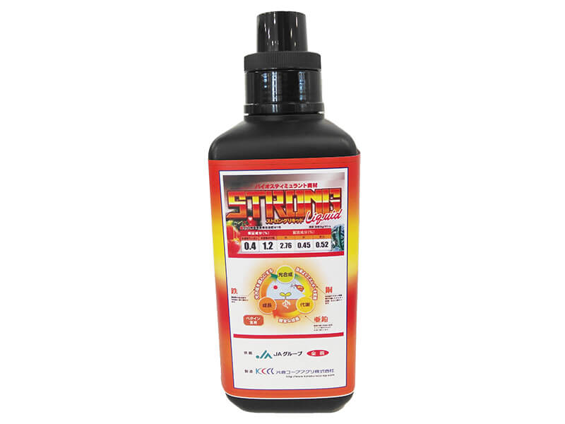 ストロングリキッド(以下、ストリキ)は2021年に市販されたBS資材だ。マンガン・ホウ素・鉄・銅・亜鉛といった植物の生育に必要な微量要素とベタインや有機酸をバランス良く配合し、光合成・代謝・生長の効率を高める。環境ストレスや病気に負けない体づくりに役立ち、健全な作物の生長を助ける効果があるという。鳴坂先生が詳しく解説してくれた。