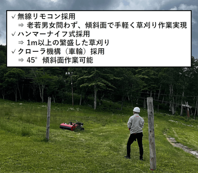 急勾配の斜面における草刈作業は刈払機を用いて人手により行われる場合が多い。そのため姿勢が不安定で、作業中の転倒・転落事故が多く発生していた。また、中山間地域は平地に比べて斜面等耕作地周辺の面積割合が高く、その管理作業が作業者の大きな負担になっていた。