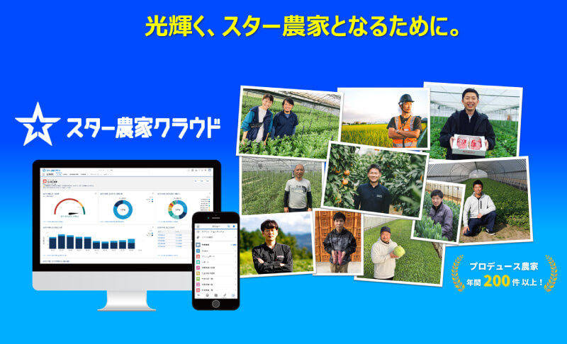 「スター農家クラウド」は、売上3,000万円を超えてまだまだ事業成長を目指すスター農家・スター農家予備軍を対象に、組織作りコンサルティングとセットで提供する経営管理システム。農家が成功する道筋の設計とフォロー体制に特に注力している。売上管理・生産管理といった経営情報を一元管理し、データ化することで経営判断を手助け。コンサルティングとセットで提供することで、農家のビジョンの実現と事業成長に向け伴走支援を行う。