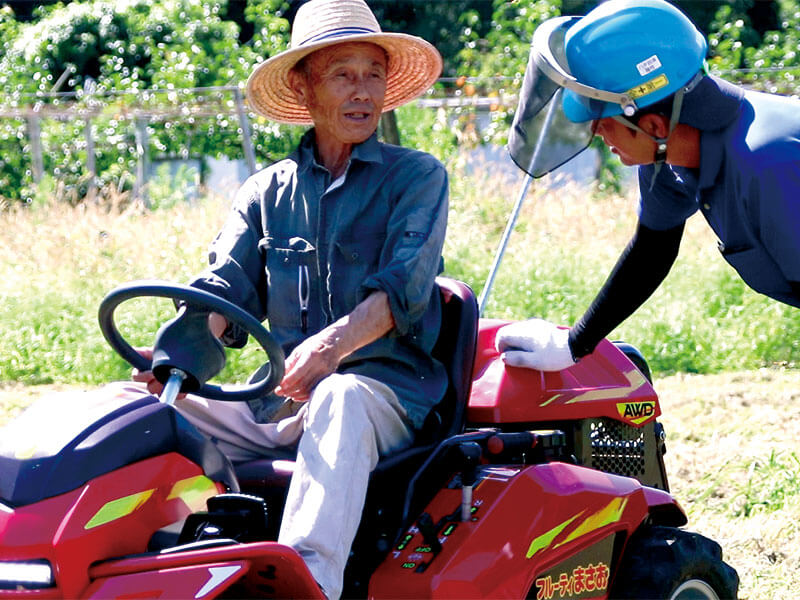 また、草の刈高さは5cm以上にしてわざと残し、土壌に直接日光があたる土焼けや、果樹に病気をもたらす細菌類が実や葉に及んでしまうのを防ぐという。食べるもので人間の身体はできているという考えを持ち、作物が育つ土壌にこだわる秀太さんは『フルーティまさお』は乗り心地だけでなく刈跡までも自分の栽培方法にピッタリと話す。