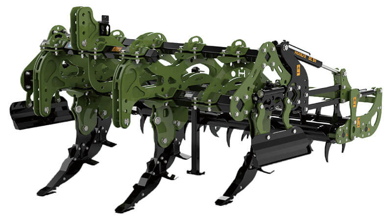 「粗起し」と「心土粉砕」を7~9km/hの高速で同時にこなす。チゼルが持ち上げた土塊を後部に設置されたスパイクローラーが細かく砕き、残渣物等をしっかりとすき込み鎮圧、作業跡をきれいに均平に仕上げてくれる。