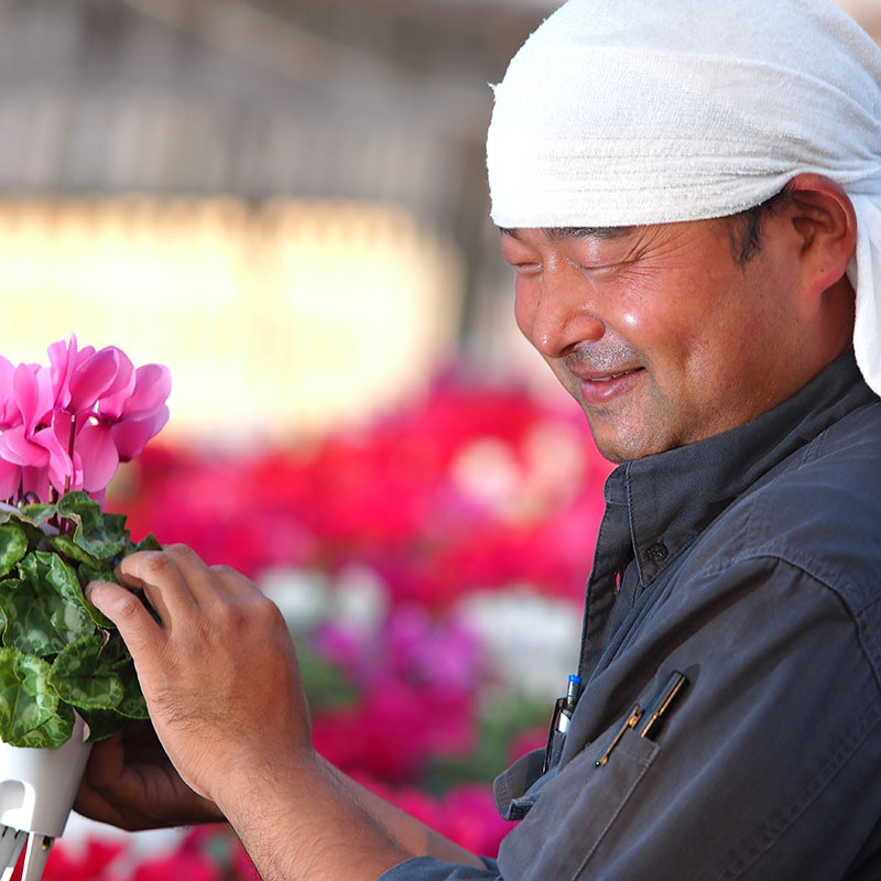 完全受注型の花苗農家として、ナショナルチェーンからローカルホームセンターまで幅広く契約。地元のホームセンターとはマーケティングから商品開発、販売戦略に至るまで二人三脚で決定するという、独自のスタイルと強い関係性を確立。また、購買ペースを数値分析し、苗ポット陳列(スペーシング)も行った状態で納品することで、店員はそのまま店頭に出すだけでよく、“店員が売り易く、消費者のニーズを捉えた商品づくり”を実現している。