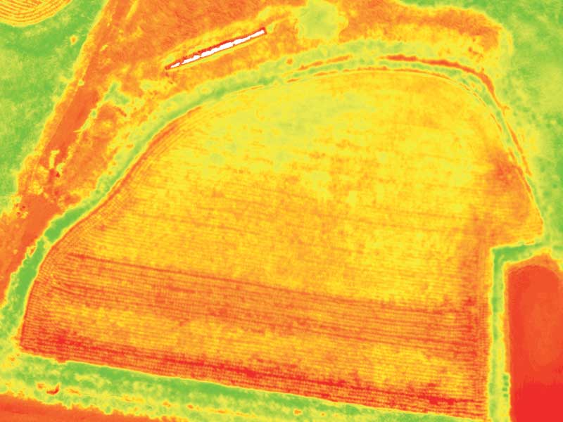 除草必要箇所(上側黄色い箇所)と除草箇所(下側赤いライン)などの作業状況が確認できる。過去の情報を照らし合わせることで、より鮮明な田んぼの状況も見える。例えば田んぼ右角が若干赤いが、ここは毎年深堀してしまい生育が悪い場所だ。NDVIで一目でわかるので栽培管理に利用できる。