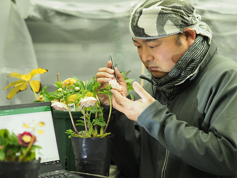 「就農したのが2003年なので、栽培歴は16年くらいになりますね。はじめの5年間は、試作と研究を繰り返す日々が続きましたが、自家採種しながら、やがて安定的にオリジナルのクリスマスローズを生産できるようになりました。また、今シーズンから、新しい手法を用いた栽培を本格的に始めています」。