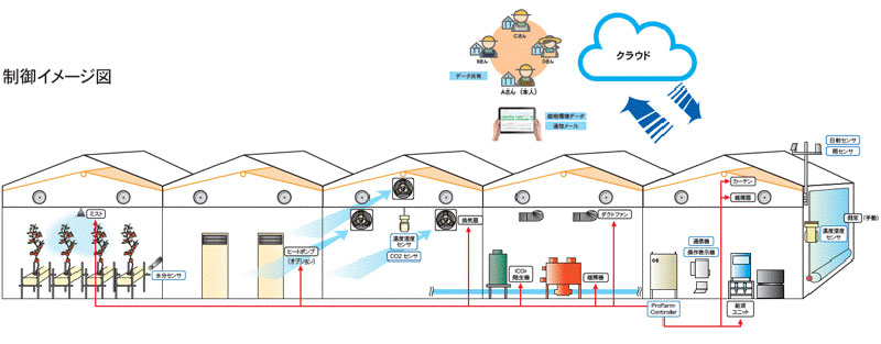 プロファーム T-キューブは、ハウス側面の換気窓にファンを設置。センサーで室内の状態をチェックし、必要に応じて強制的に気流を生み出して換気することで、最適な環境を保つ。また機器稼働のムリ・ムラ・ムダをなくすことで、CO2排出量の低減も実現する。