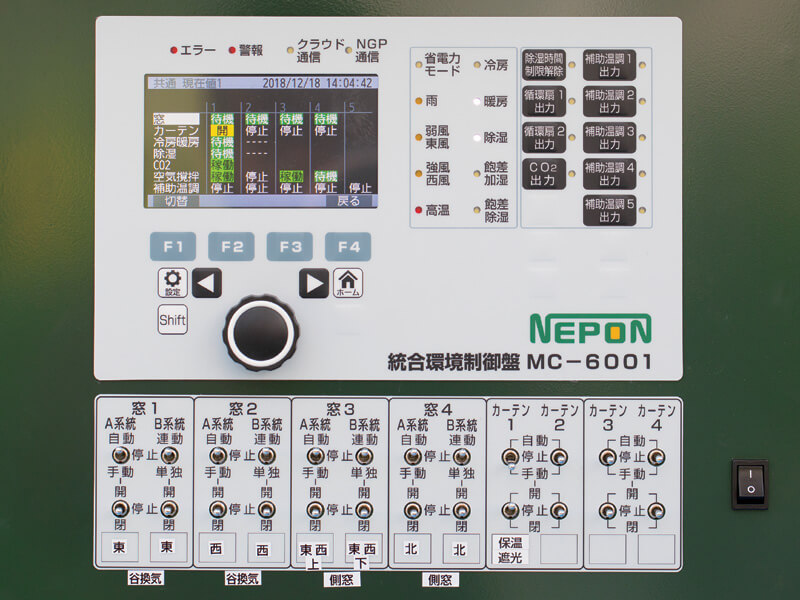 今回、ドロップファームで導入した統合環境制御盤「MC-6001」では、8段階の温度管理が可能な換気窓制御をはじめ、4軸4層のカーテン制御、暖房機とヒートポンプ制御が可能な冷暖房制御、換気窓や暖房機などを統合制御する湿度制御、光合成を促進するCO2制御などの機能を1台で集中管理できる。ミスト装置等を使った飽差管理やクイックドロップにも対応するという。