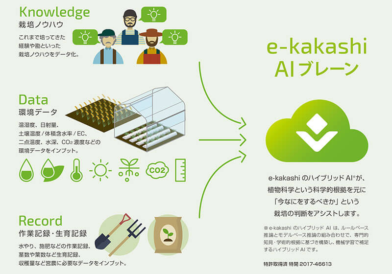 スマート農業に興味のある農業関係者なら必ず一度は、『e-kakashi』の名前を聞いたことがあるはずだ。IoTセンサーで田畑やビニールハウスといった屋内外の圃場から収集した環境データを植物科学の知見を取り入れたAI(人工知能)で分析。その結果を最適な栽培方法として提案することで農業従事者の判断を支援するサービスだ。
